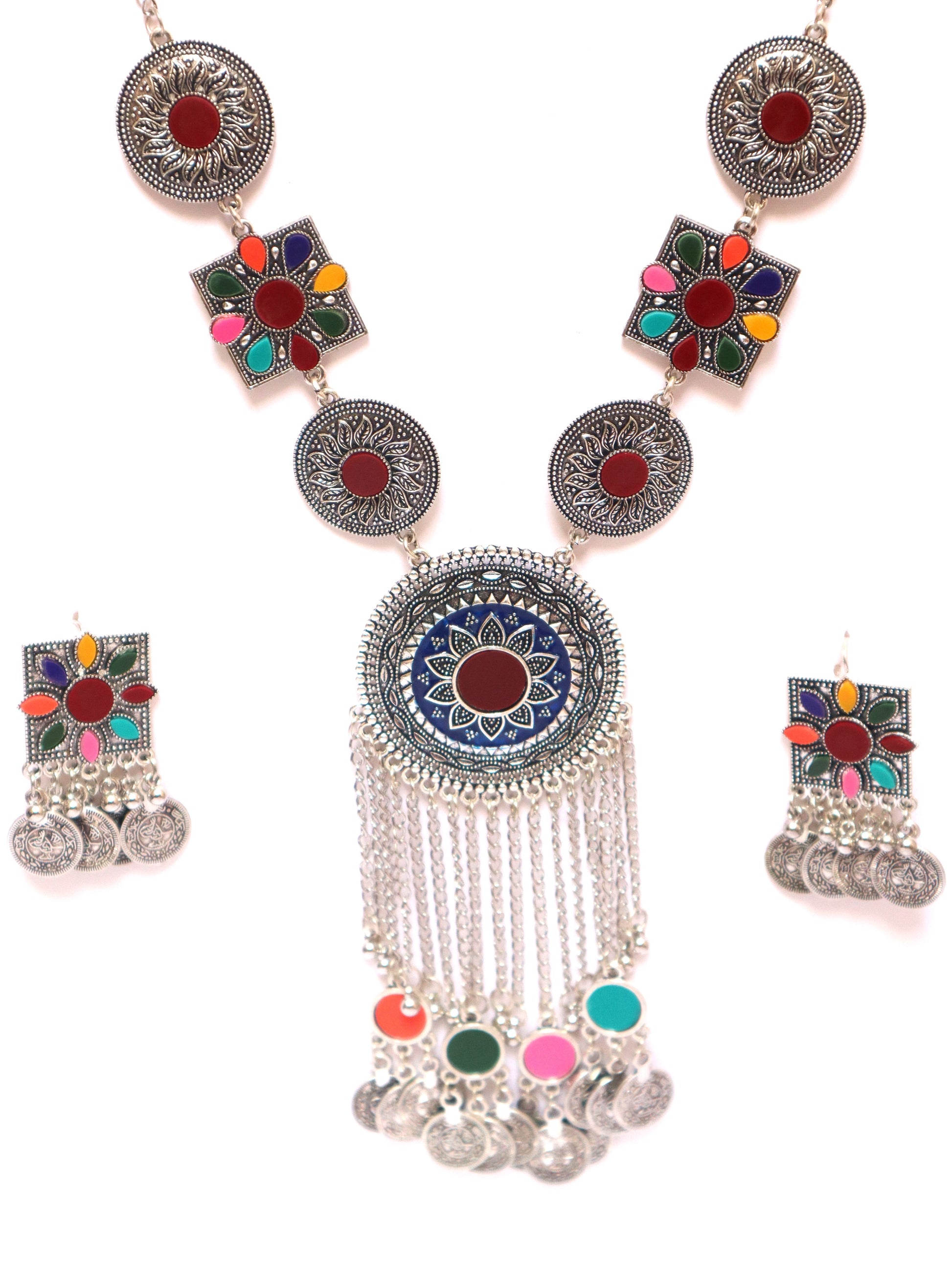 Boho Tribal Oxidized Silver Necklace Set | Multicolor Enamel & Mirror Work |